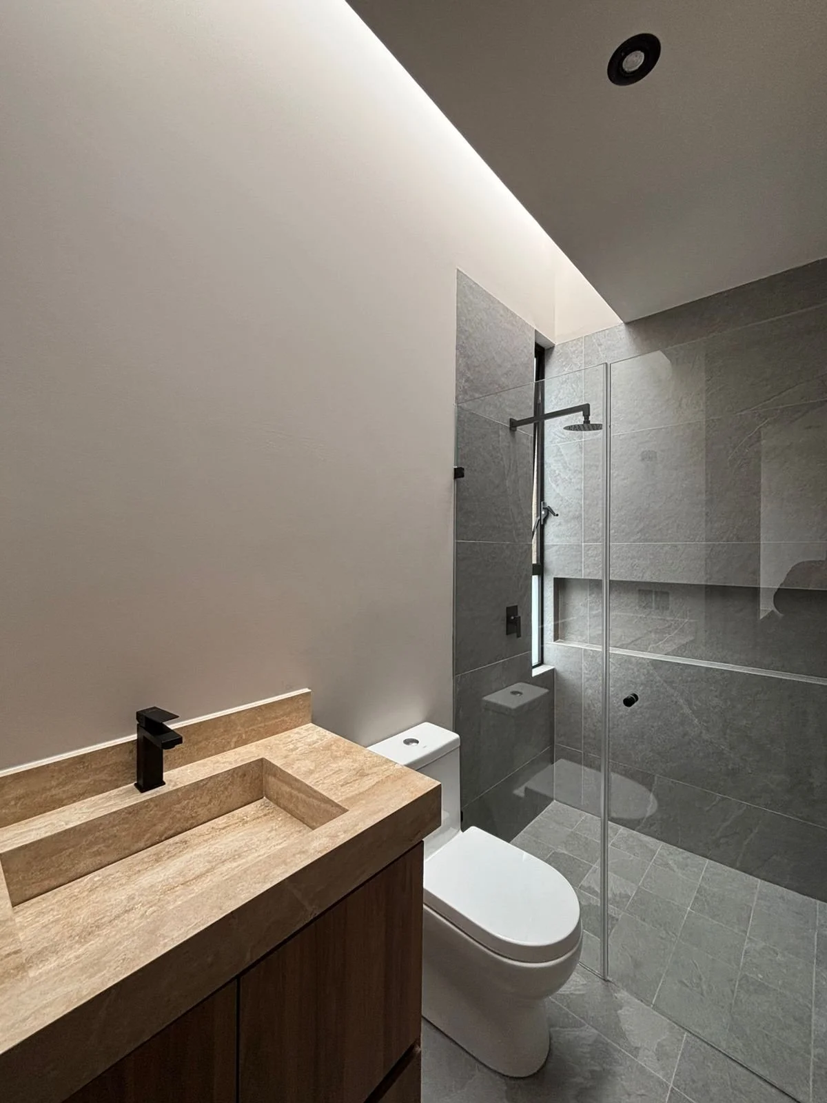 230 m2 de construcción en dos plantas, área social libre, cocina equipada, habitación con baño completo en PB, más medio baño. En planta alta, recámara principal con vestidor y baño completo, dos recámaras cada una con closet y baño propio, excelente ubicación y acabados de primera.